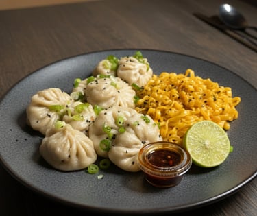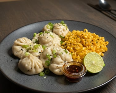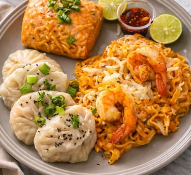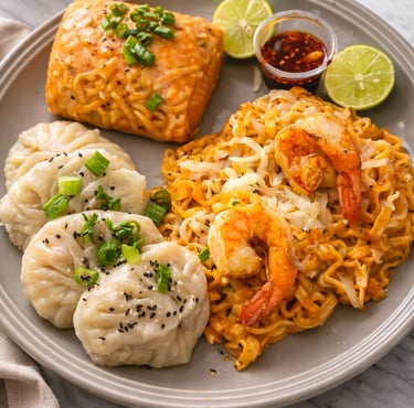4 dumplings mixtos acompañados de buldak de tu preferencia, 1 spring roll y 2 camarones jumbo.