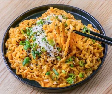 Hojas de arroz rellenas de buldak de tu preferencia con trozos de camaron y queso gratinado
